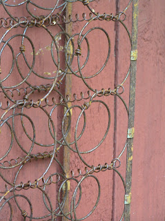 Paikallisen kirpparin pihalla on hauska pihakoriste joustinpatjojen rungoista tehtynä. Minä ajattelin sitten käyttää meidän kaksi vanhaa joustinpatjan runkoa krassin tukena. Joku muu oli keksinyt saman jo vuonna 2005, huomasin kun selailin vanhoja Viherpiha-lehtiä.
