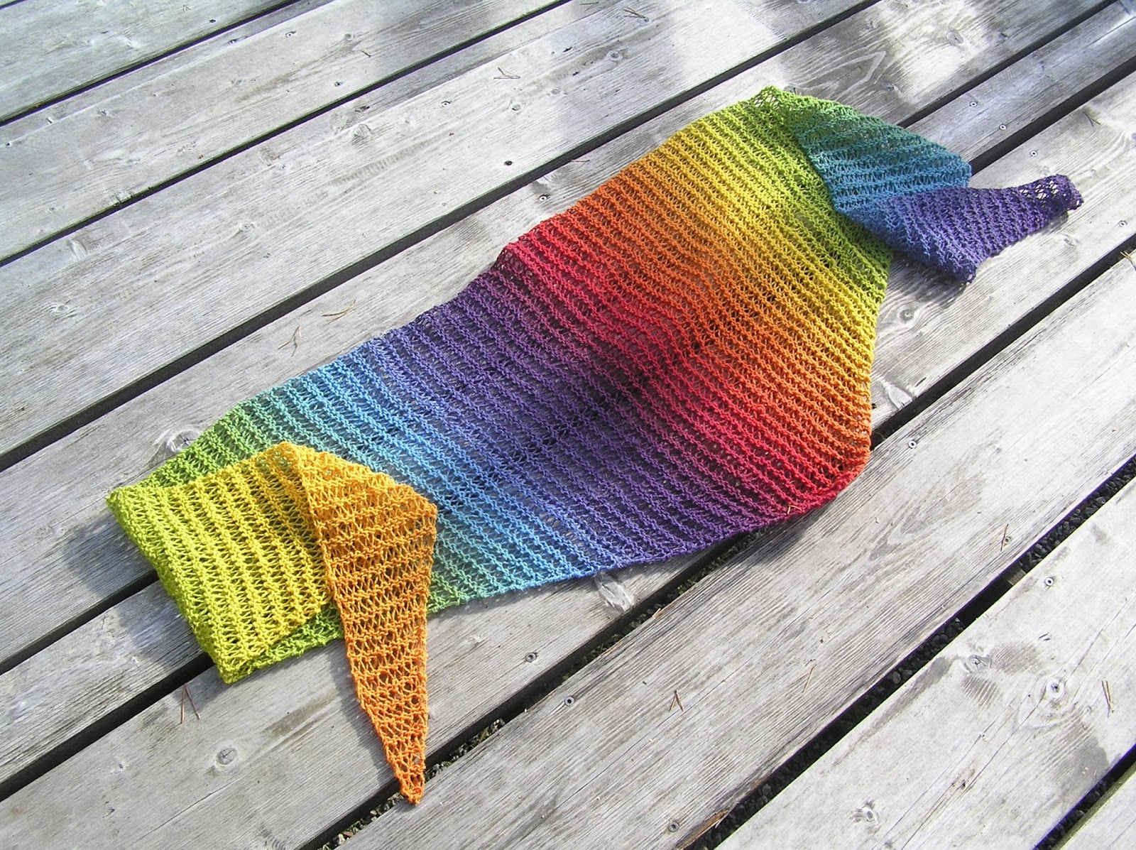 Vielä toinen huivi samalla ohjeella kuin edellinen. Kaksi kerää puuvillalankaa, en vain muista mitä lankaa. Vyötteet joutuneet jo roskiin, mutta paikallisen lankakaupan loppuunmyynnistä joskus ostettu.